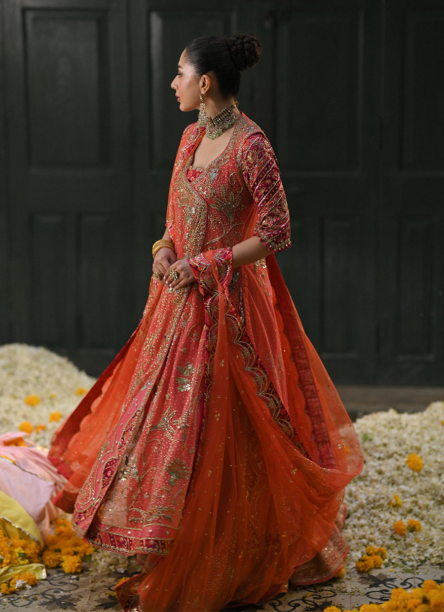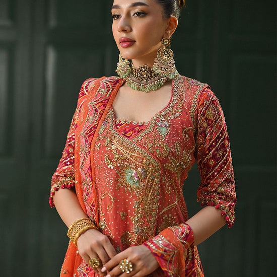 A beautiful modern day angharkha that you will cherish for generations to come. A stunning striking coral net angrakha adorned with raw silk and hand blocked applique, creating a captivating blend of textures and patterns. Intricate handwork including gota, sitara chann, and thread work adds a luxurious touch and intricate detailing to the angrakha. The angrakha is paired with the coral zari fabric lehenga, which exudes elegance with its shimmering texture and is finished with a zari border that complements the ensemble beautifully. Completing the ensemble is a coral net dupatta embellished with sitara chann all over, adding a subtle sparkle and enhancing the overall appeal. The dupatta is edged with a block printed applique and handwork, which adds a touch of traditional charm and completes the look with finesse. This ensemble is perfect for special occasions where you want to make a statement with its vibrant color, intricate embellishments, and timeless elegance.
