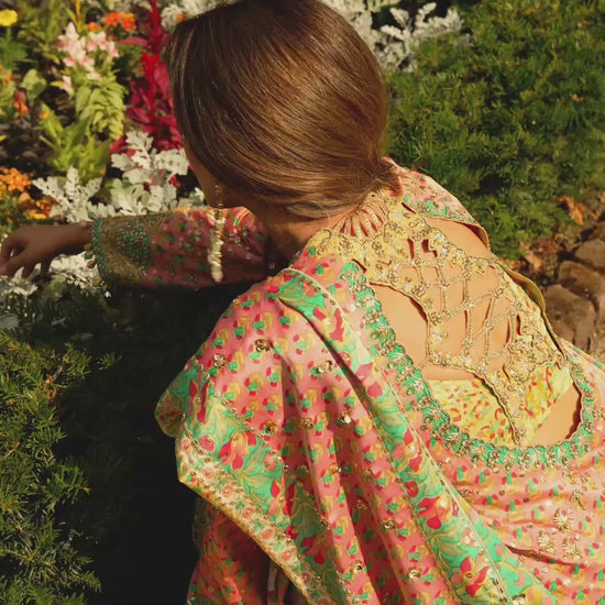 The look is completed with a hand-blocked dupatta in tones of pink and kiwi, delicately adorned with intricate handwork and edging that adds depth, texture, and an irresistible pop of color.