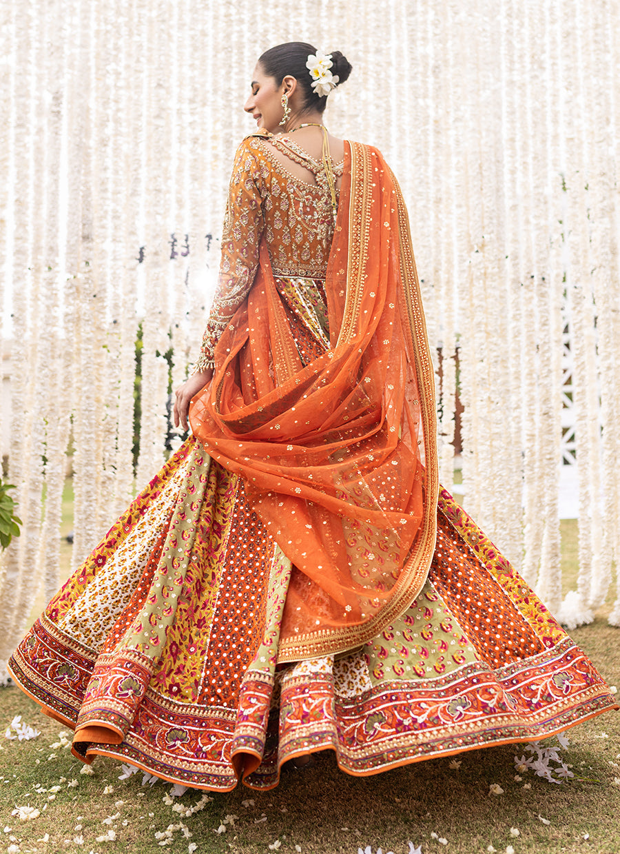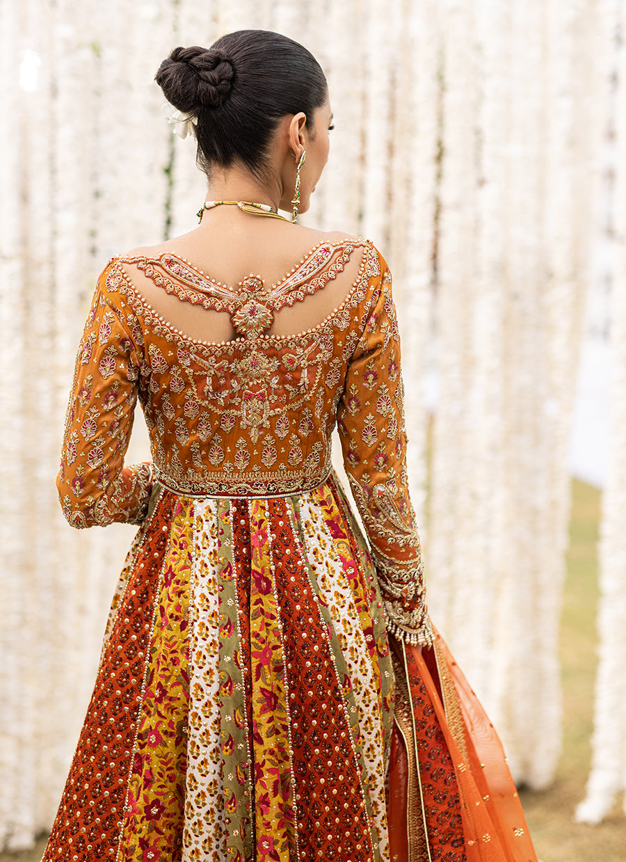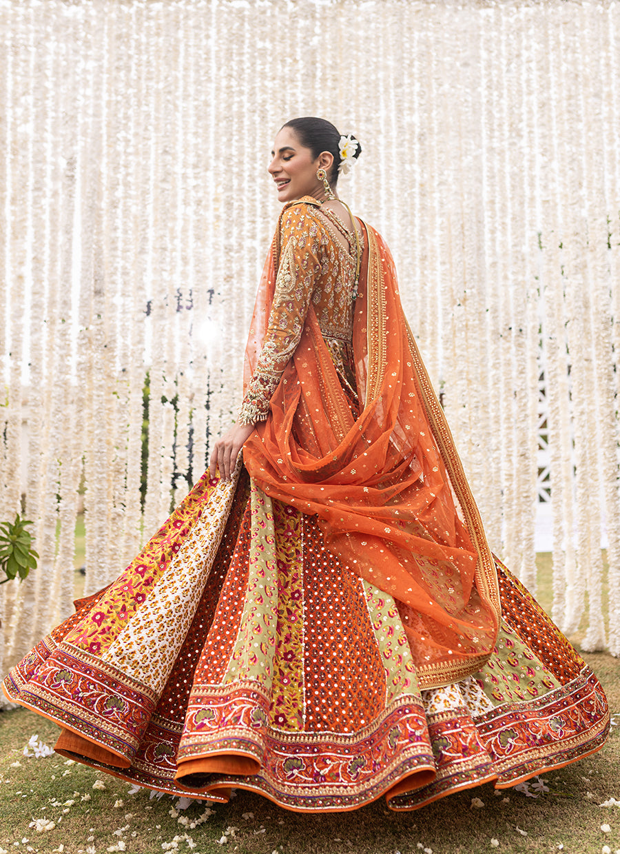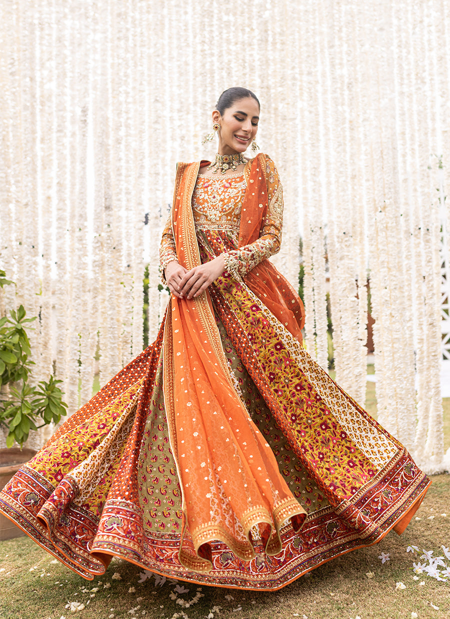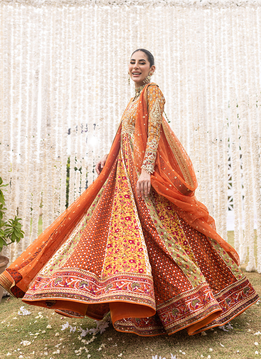 An absolute show stopper. This kalidaar is designed to give a slender waistline an extra flaring kalis for that unforgettable twist and stunning silhouette. The burnt orange bodice and sleeves cut from pure zari fabric featuring gorgeous hand block print intricate zardozi and colourful French knots with hints of gota and tilla work.