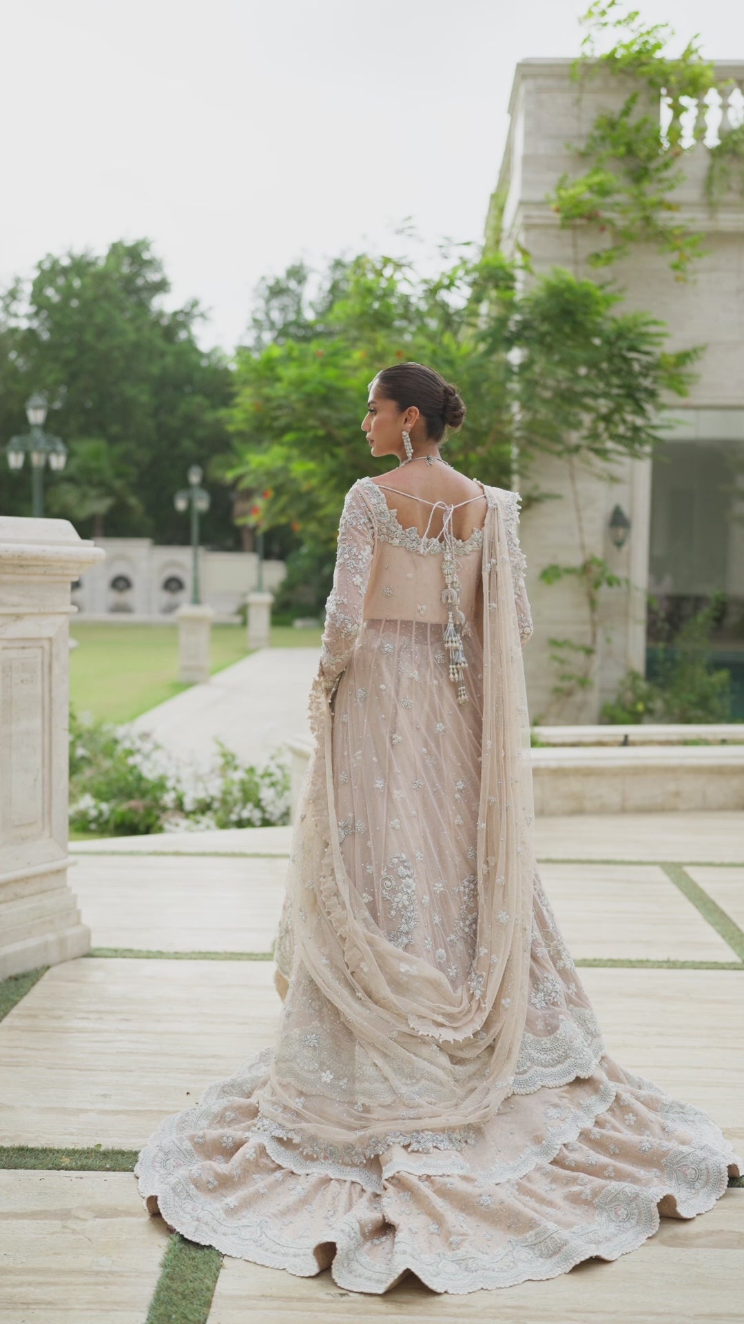A vision of timeless grace and femininity, this pale pink ensemble captures the essence of refined bridal elegance. A dreamy pale pink net kalidaar, intricately embellished with exquisite zardozi handwork, delicate 3D floral appliqués, shimmering Japanese cutdana, and soft Resham embroidery. Paired with a regal jamawar farshi lehnga that adds timeless grandeur to the silhouette. The look is completed with a matching net dupatta, beautifully adorned with coordinating embellishments — creating a romantic and elegant ensemble, perfect for a modern bride with a love for traditional craftsmanship.