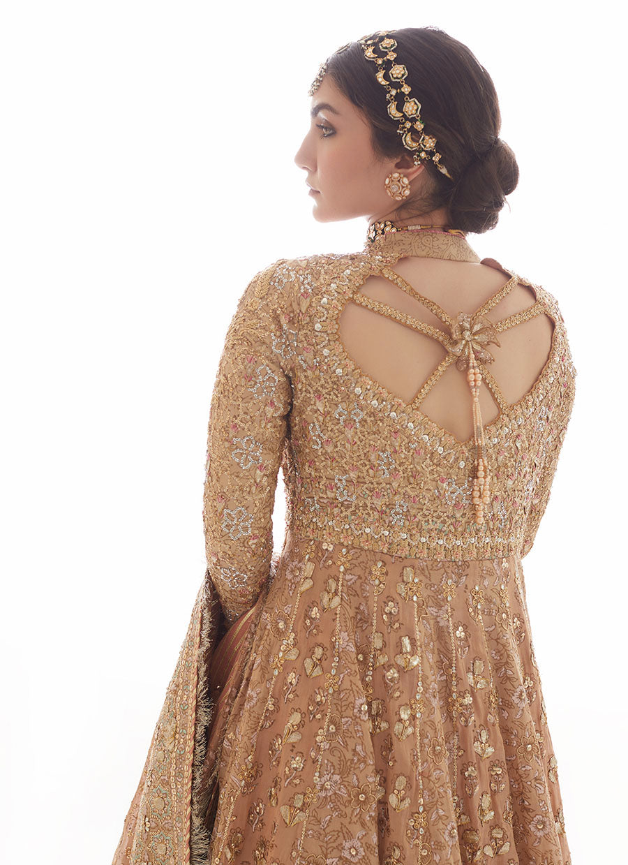 Wear this Farah Talib Aziz Signature ensemble to a wedding, special event, or any occasion where you want to make a statement. The combination of the rose gold tissue, intricate handwork, and elegant lehnga creates a stunning look that is sure to leave a lasting impression. The shirt and dupatta are crafted from rose gold tissue, adorned with intricate block print and delicate handwork layered over it. The champagne gold sequins, gota, tilla handwork, and silk threadwork in shades of pale pink and mint green add a touch of glamour and elegance to the ensemble. The pink net lehnga is the perfect complement to the shirt and dupatta. It features elegant swirls at the bottom, creating a mesmerizing and graceful look. The lehnga is designed to flow gracefully as you move, making you feel like royalty.