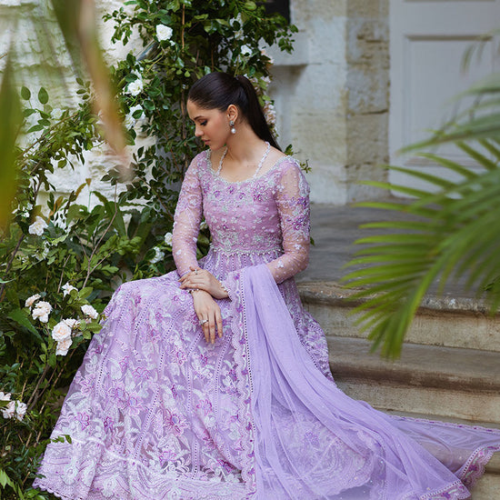 Beautifully crafted from a remarkably glamourous shade of lavender organza, the ensemble strikes the perfect balance between elegant and eye-catching. This flowing kalidaar is richly embroidered with intricate, silk threadwork, while the bodice is further uplifted with silver and pearl hand embellishment and little pops of pale pink blooms. The cascading panels flow gracefully bringing irresistible movement to the ensemble. The kalidaar is paired with a delicate tulle dupatta in coordinating lavender trimmed with embroidered borders to give the outfit a stunning flair.
