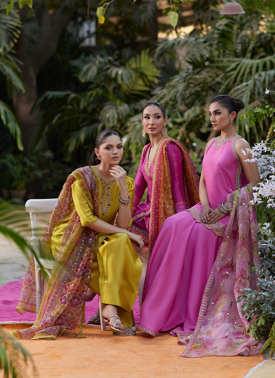 A nod to modern day glamour with this stunning hot pink ensemble, perfect to carry you from day weddings to night festivities.