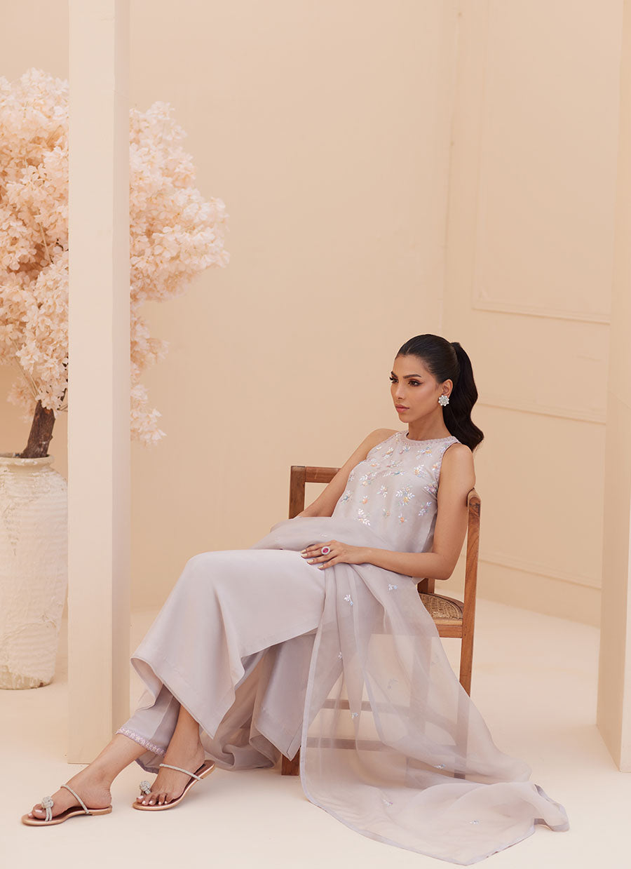 Experience the art of looking effortlessly classy in this sparkling silver ensemble. Crafted from pure raw silk the Silvia ensemble is decorated with subtly shimmering sequin blooms. The sleek, uber flattering straight silhouette of this ensemble will have you reaching for it whenever you really want to make an impact!The elegant, air pure organza dupatta dotted with sequin blooms completes the outfit. Pair yours with the pure raw silk pants (as shown) and sparkly flat for a moment stealing look, day or night!