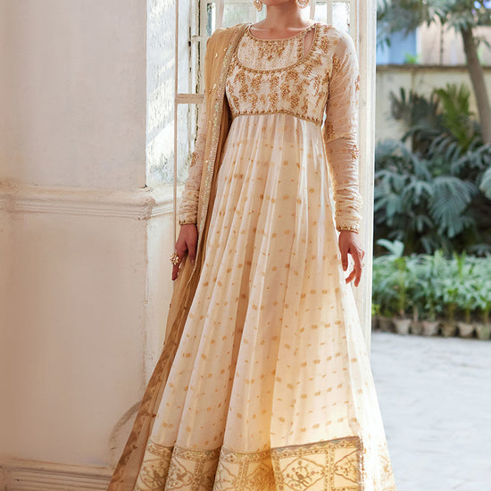 Ivory voluminous kalidaar with asymmetrical double neckline and elegant churidaar sleeves.