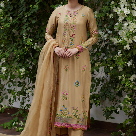 A canvas of dull gold is adorned with stunning composed embroidery in majestic tones. Delicate florals bloom along the neckline, daaman and sleeves, with hand embellished motifs further uplifting the shirt.