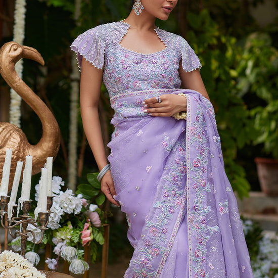 An absolutely unmissable saree, cut from elegant lavender organza. Adorned with intricate thread work, 3d florals, Swarovski crystals and pearls it is truly a piece of art. Paired with an impeccably tailored blouse cut from lavender zari silk. The blouse has an uber-flattering neckline with elegant organza short sleeves.