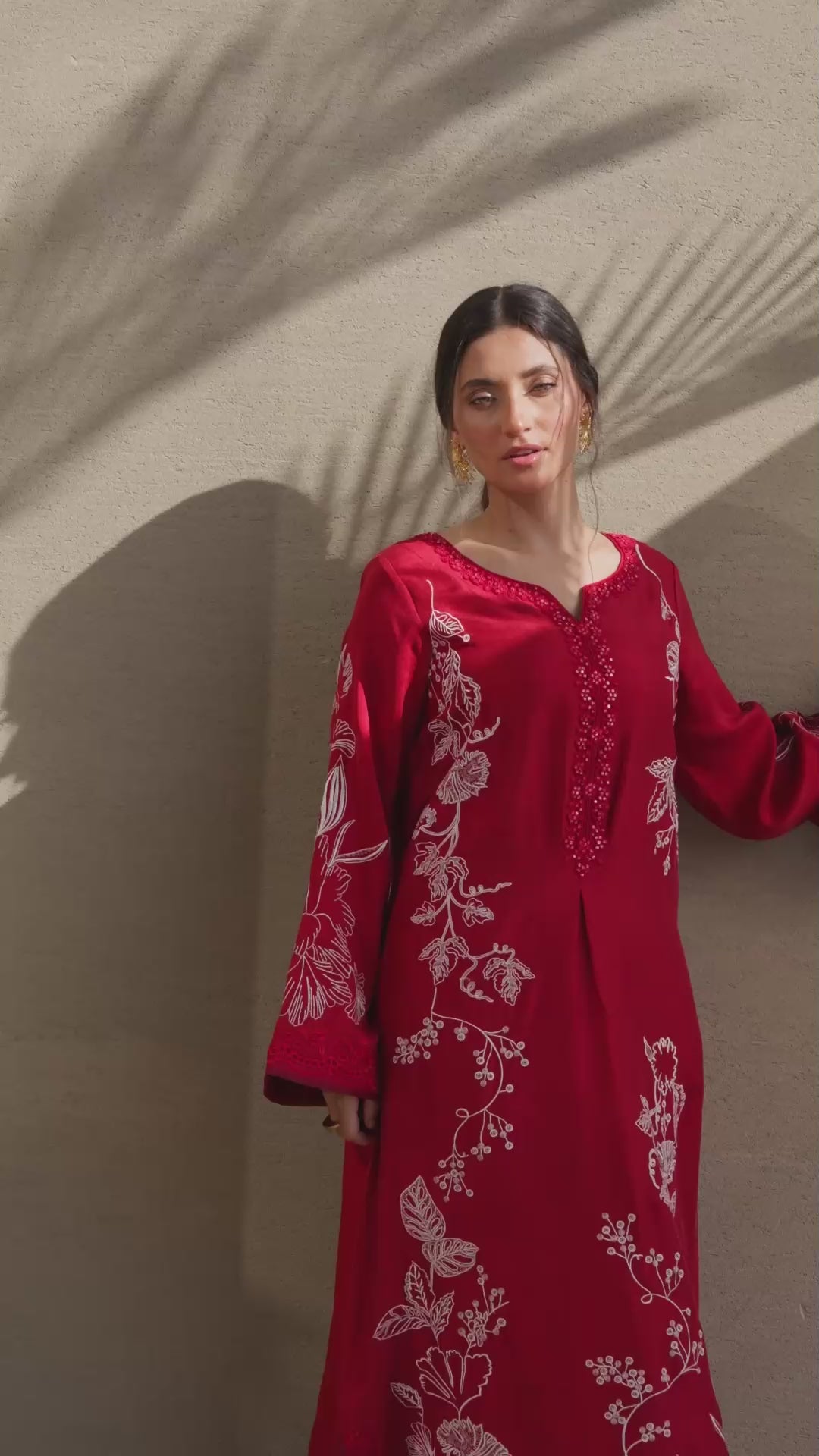Bold and captivating, this deep scarlett, raw silk kaftan is intricately embroidered with ivory blooms and features a hand-embellished neckline for a touch of refined sparkle. The appliquéd schiffli border adds structure and sophistication, completing a look that is effortlessly striking and timelessly elegant.