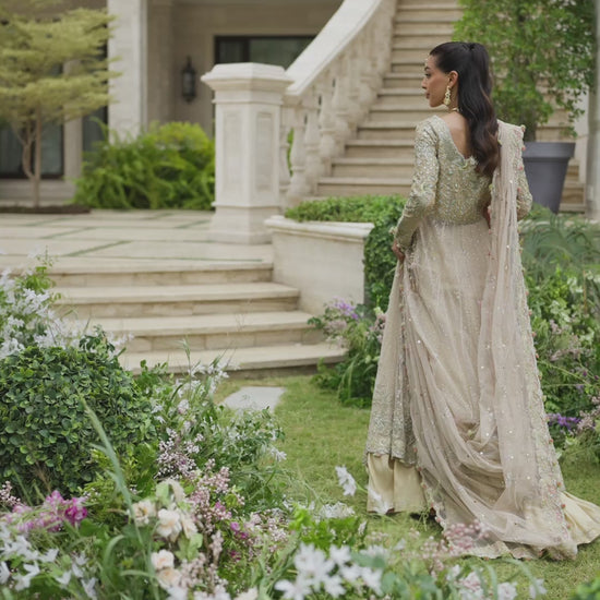 • Kalidaar adorned with dabka, zari, sequins, stones, mukaish, and resham thread embroidery