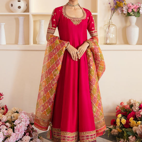 Beautifully crafted from a remarkably glamourous shade of Fuchsia silk, the Sitya Kalidaar and dupatta strikes the perfect balance between elegant and eye-catching. The gorgeous jewel tone of this universally flattering ensemble is made even more radiant by the liquid fluidity of the luscious, pure silk.