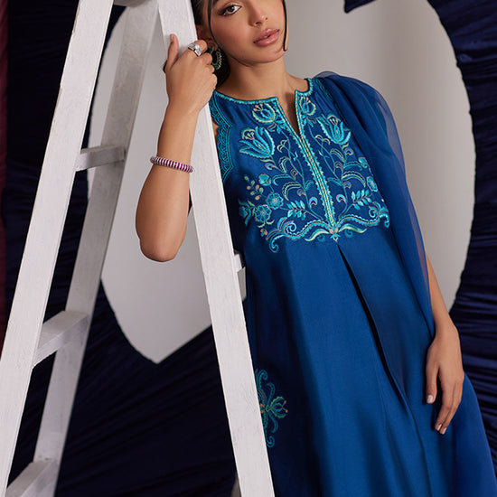 The teal Long Shirt cut from shisha silk is a stunning blend of tradition and modern design. The fabric’s luxurious texture is beautifully enhanced by intricate botanical embroidery, with delicate scalloped borders running throughout. The shirt’s contemporary silhouette features practical pockets and a double scalloped hem, adding a refined touch. Paired with a sleek izaaar and a pure organza ombre dupatta, the ensemble exudes elegance and flow. The dupatta’s ombre effect creates a soft, graceful drape, making this outfit perfect for any and every occasion, effortlessly giving you the ultimate laid back luxe look!!