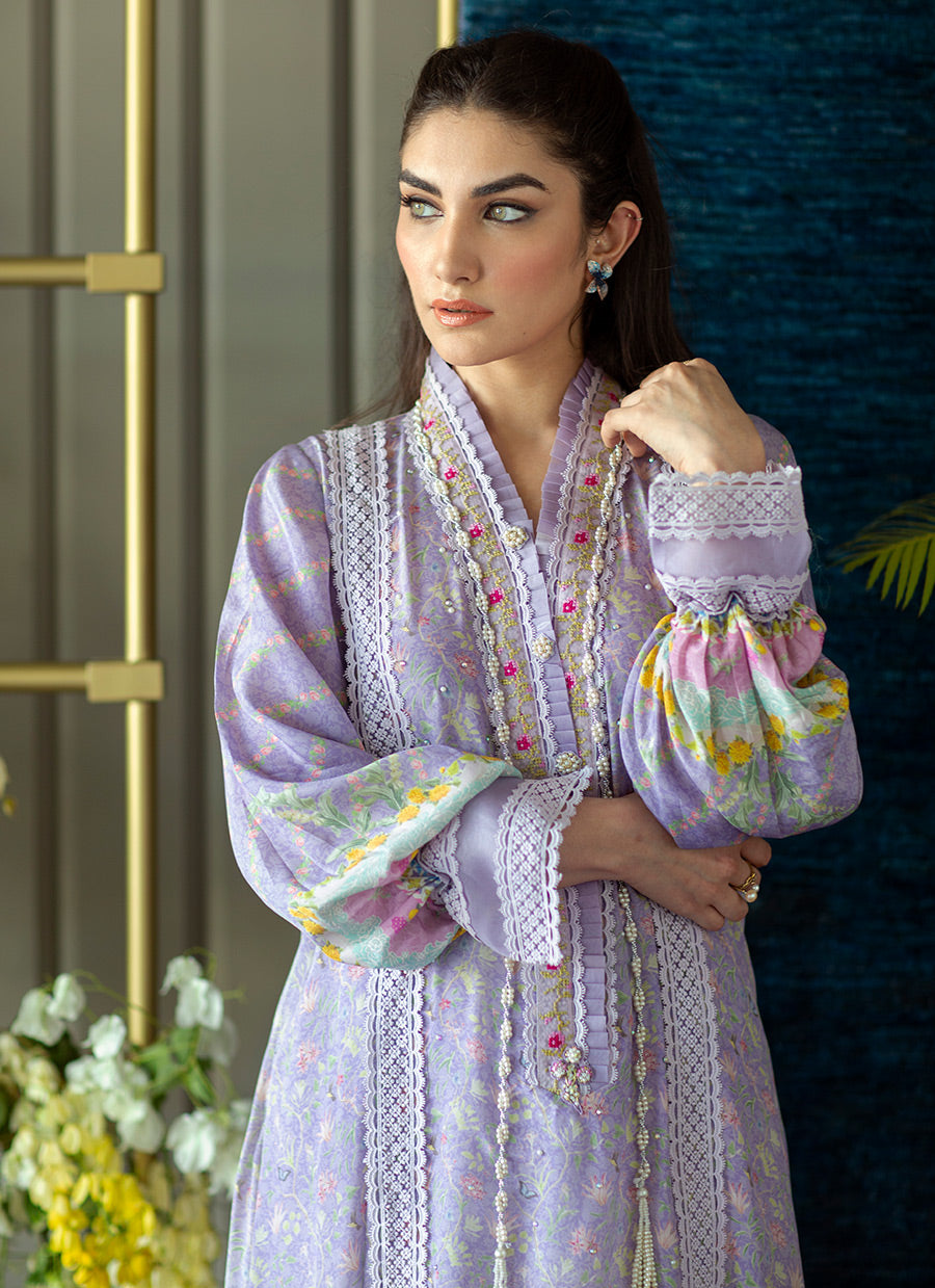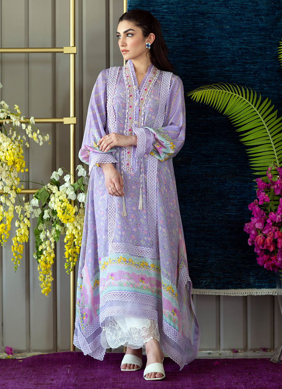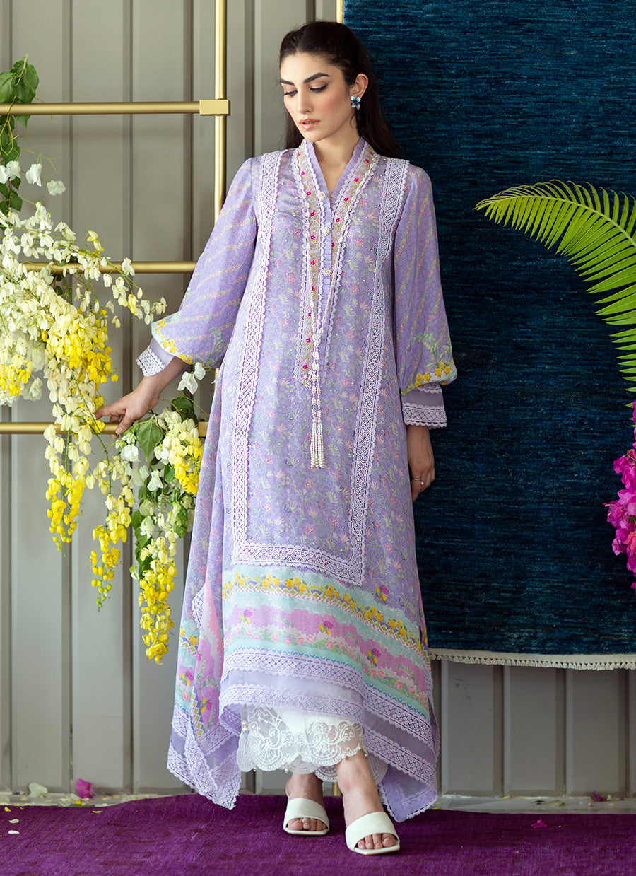 Designed in-house at the FTA Studio in Karachi, each of our printed tunics is created with extreme attention to detail. Cut from crepe silk, this romantic, lilac tunic is adorned with delicate pastel flowers as well as pretty cross stitch flowers blooming along the neckline. A breezy, silhouette with an abundance of that irresistible signature FTA detailing, is further enhanced by a statement chiffon statement sleeve with an intricate lace cuff. All you need this festive season are some unexpected details, pure, luxe fabrics and the ultimate, cool pastel tones!! Take a page out of our style book and wear yours with our culottes and some statement earrings!