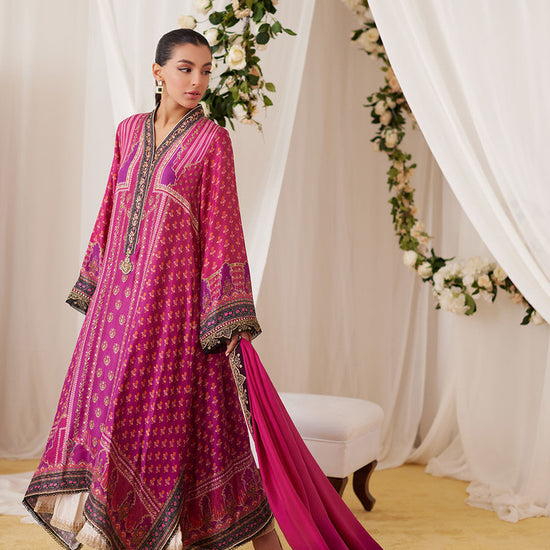 A canvas of vibrant magenta is emblazoned with an exclusively designed FTA digital print and embroidery on the neckline and sleeves. The accompanying pure medium silk dupatta with stunning embroidered borders completes your ensemble. Eternally stylish, irresistible details will make this one of your smartest buys this season!
