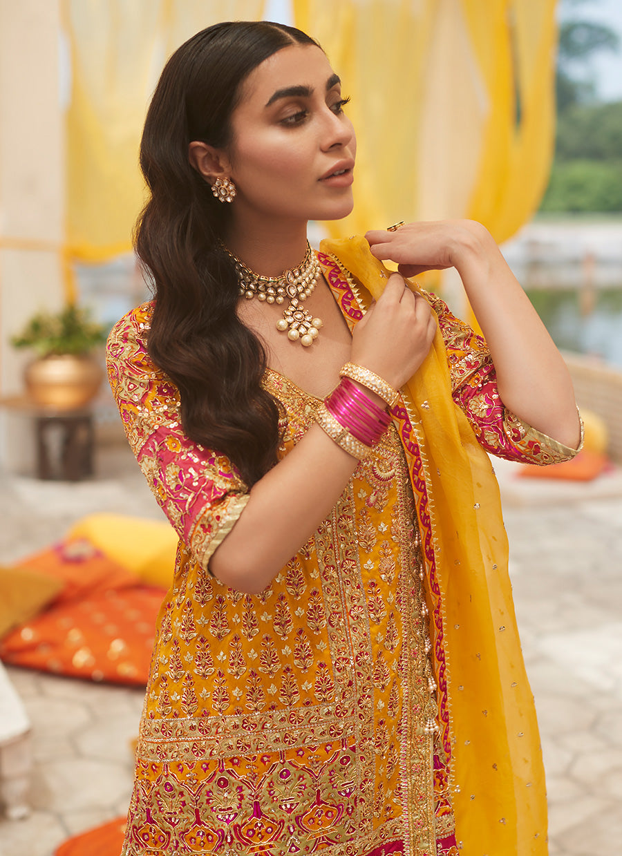 Be it a mayun, mehndi or any festive occasion to celebrate, our Sona Angarkha will be your forever go-to outfit....