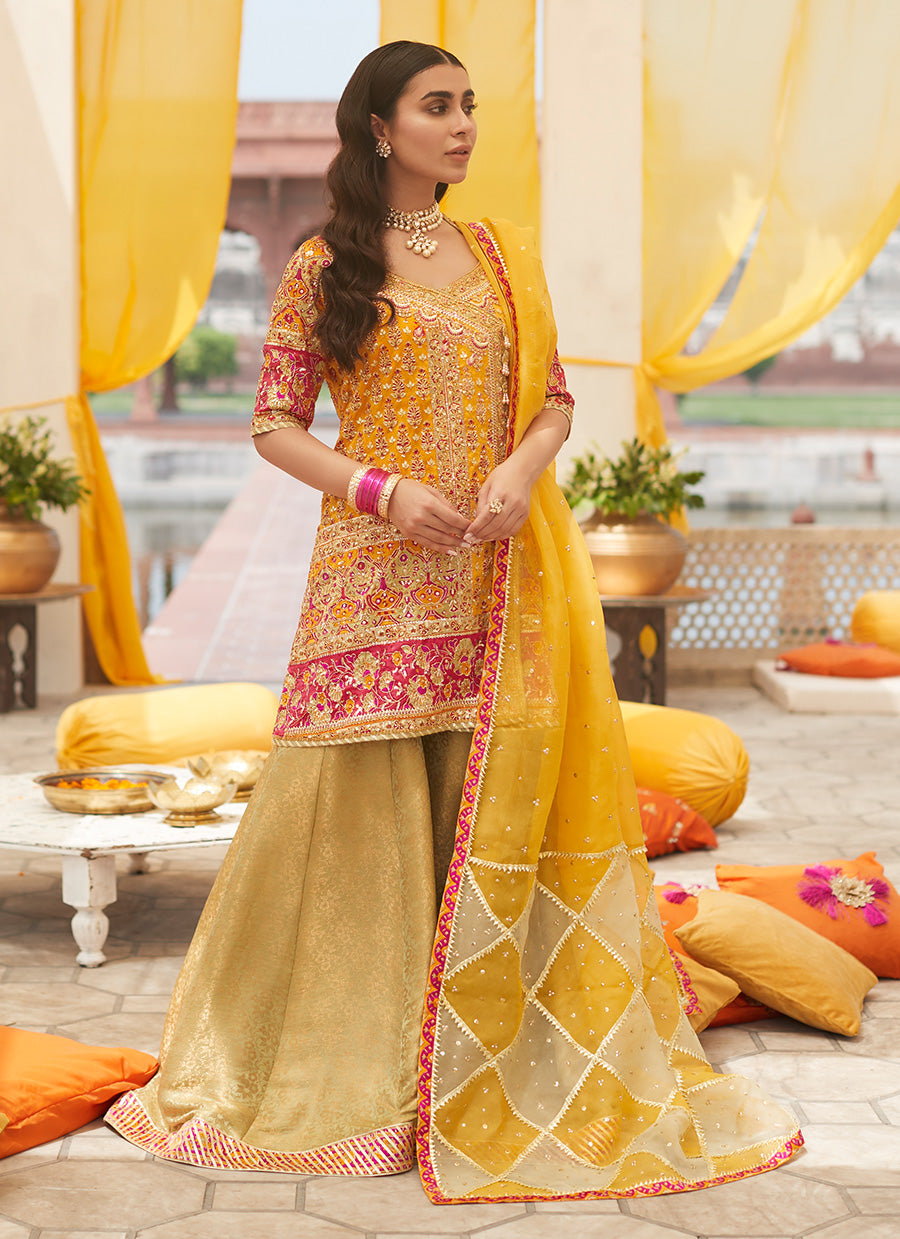 Be it a mayun, mehndi or any festive occasion to celebrate, our Sona Angarkha will be your forever go-to outfit.
