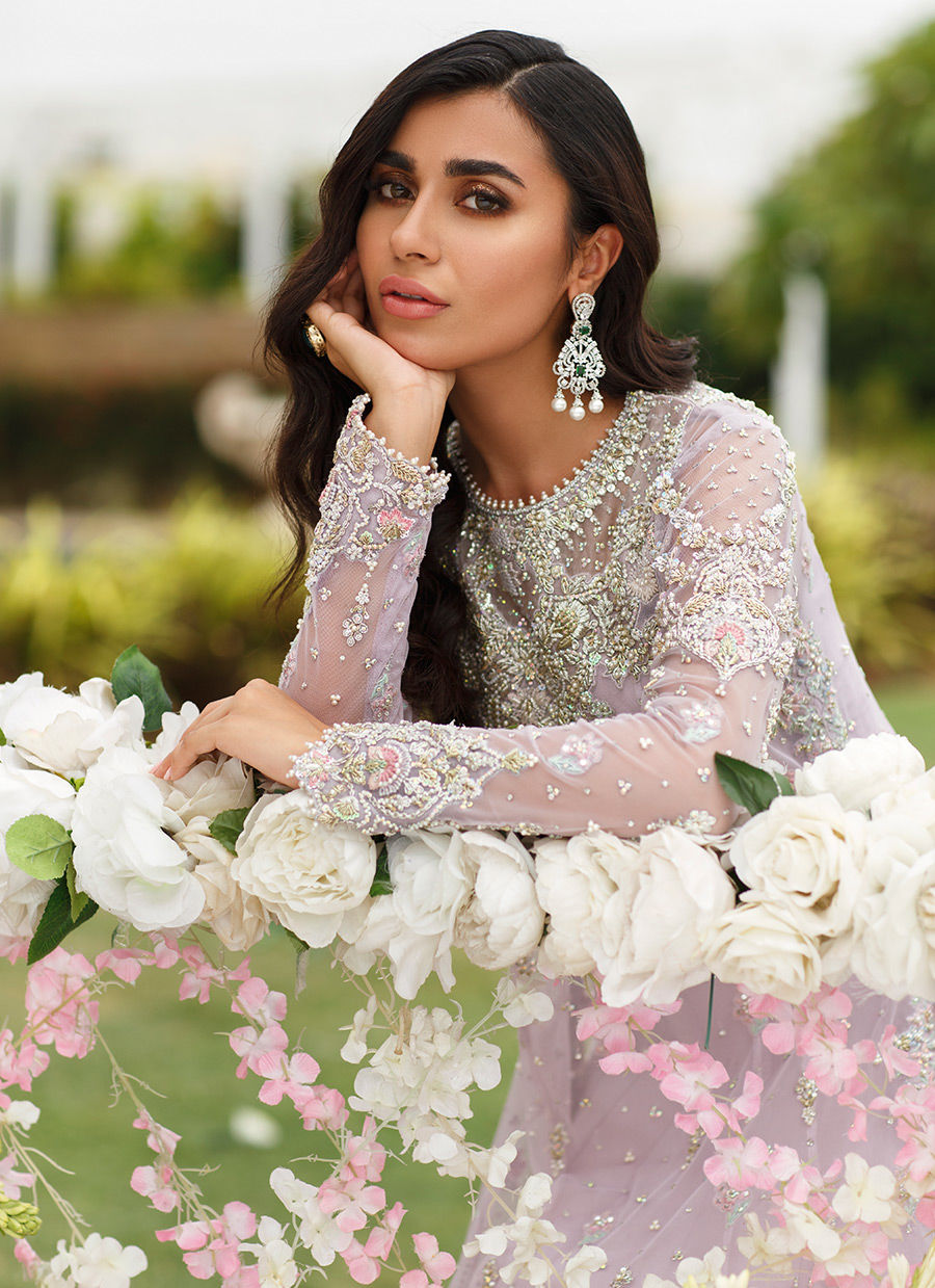 A dramatic flowing kalidaar cut from the softest lavender tulle, hand embellished with pearls, kora, dabka, Swarovski crystals, resham thread work and Swarovski crystals. To further enhance the beauty of this shirt we have added a floral trellis delicately shimmering to wow everywhere you go.