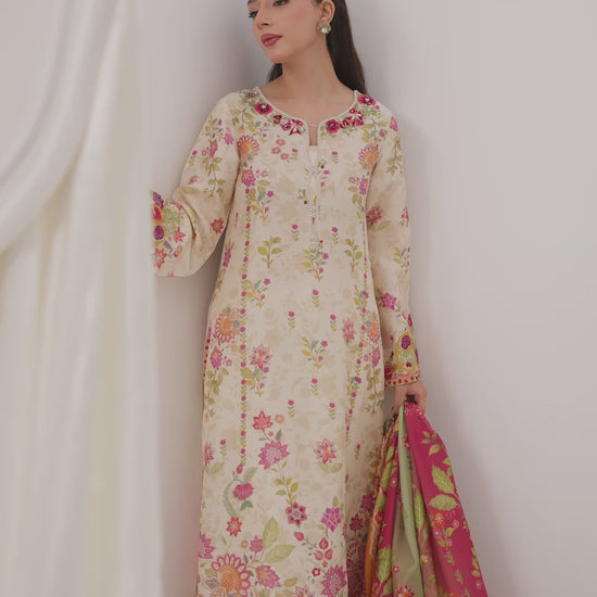 Rich in colour and character, Soreya celebrates the beauty of intricate detail brought together with effortless wearability. The raw silk tunic is brought to life with a vibrantly embellished neckline, where pearls, stones, sequins, and coloured embroidery come together in a carefully balanced composition. Framed with composed embroidered borders along the sleeves and hem, the silhouette feels polished yet expressive.