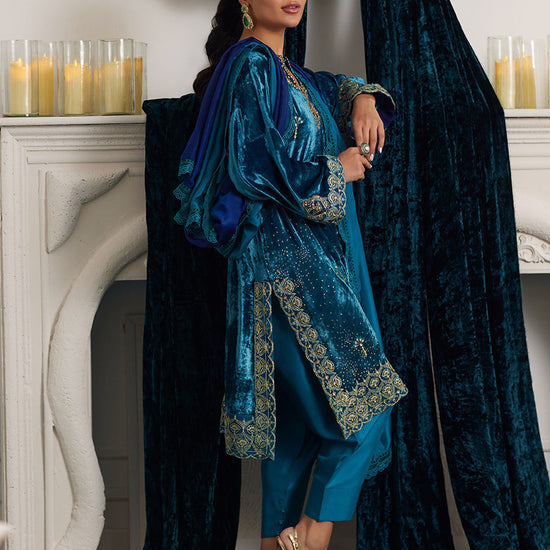 A classic teal velvet shirt with subtly shimmering gold and silver dabka work embellished with Swarovski and silk French knots.