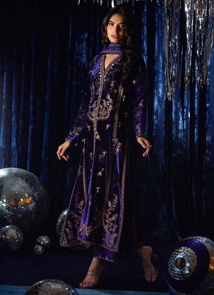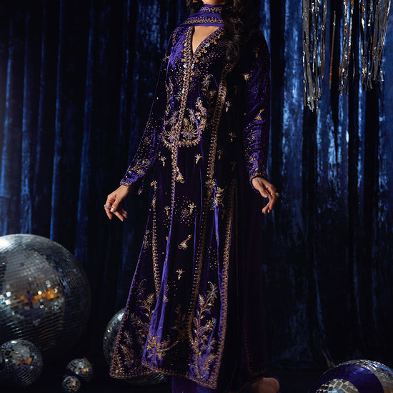 A regal masterpiece in deep purple — this velvet overlap style shirt, exudes timeless allure with its extensive zari and zardozi handwork, meticulously crafted to perfection. The richly detailed embroidery enhances the luxurious texture of the velvet, creating a statement look steeped in tradition yet undeniably modern. Paired with coordinating purple izaar pants and a dip-dyed dupatta finished with a delicate zari border, this ensemble radiates graceful sophistication and festive grandeur.