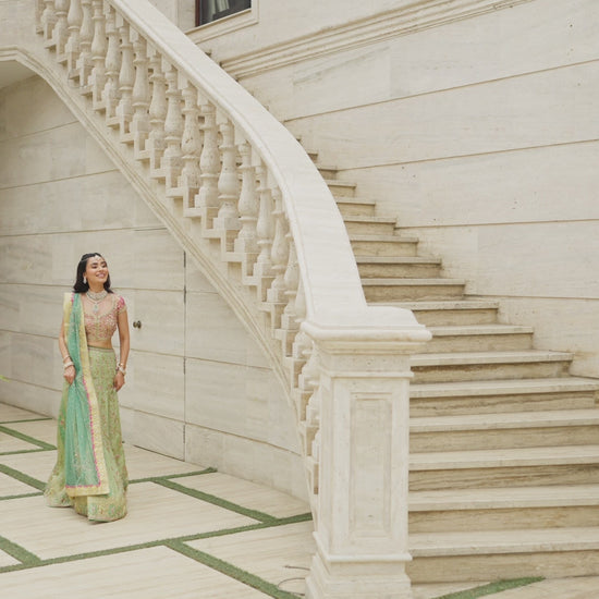 A symphony of color and craft, this lehenga choli is designed to captivate. The soft pink jamawar choli is adorned with intricate handwork and shimmering embellishments, lifted with refreshing appliqués in mint blue and green. Flowing beneath, the lehenga glimmers in three harmonious tones — mint green, dhani green, and pale mint blue — each panel layered with appliqué, embroidery, and meticulous hand embellishment. The look is completed with a sheer net dupatta, delicately scattered with chhan and finished with an embroidered border. Elegant yet vibrant, it’s a timeless expression of artistry and modern bridal charm.