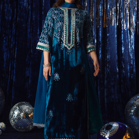A captivating deep teal velvet shirt adorned with intricate OG motifs, plush velvet appliqué, and exquisite Swarovski detailing featuring kora, dabka, sequins, and crystals along the neckline and side slits. The ensemble is paired with a pure raw silk izaar edged with zari, and a pure medium silk dupatta— a look that perfectly balances timeless opulence with modern grace.