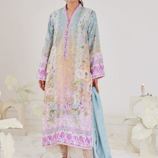 Infused with the signature FTA aesthetic, our new prints have the perfect pastel hues to make your heart skip a beat!! Cut from sumptuous raw silk, the shirt is given a striking ombre treatment, with a gorgeous ice blue that flows seamlessly into an irresistible peachy tone and then lavender. Whimsical florals bloom daintily all over the shirt, making this an absolute must have. The relaxed, much loved silhouette has a universally flattering neckline, adorned with delicate hand-made floral motifs, pearls and sequins, add an easy timeless elegance. A coordinating pure medium silk dupatta, in ice blue brings the look together with graceful flair. Pair yours with our embroidered cutwork pants as shown.