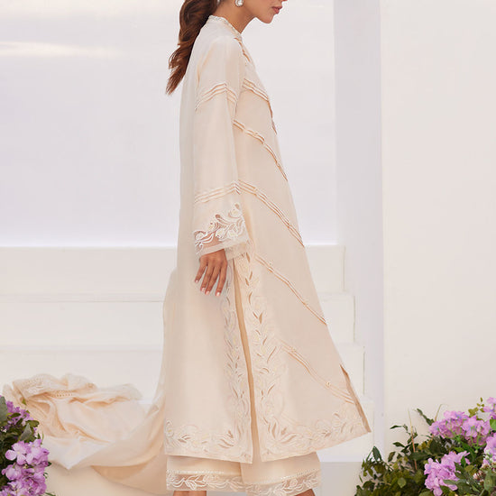 An ethereal, pure medium silk dupatta with embroidered borders in a coordinating ivory hue adds the perfect graceful touch to your ensemble.