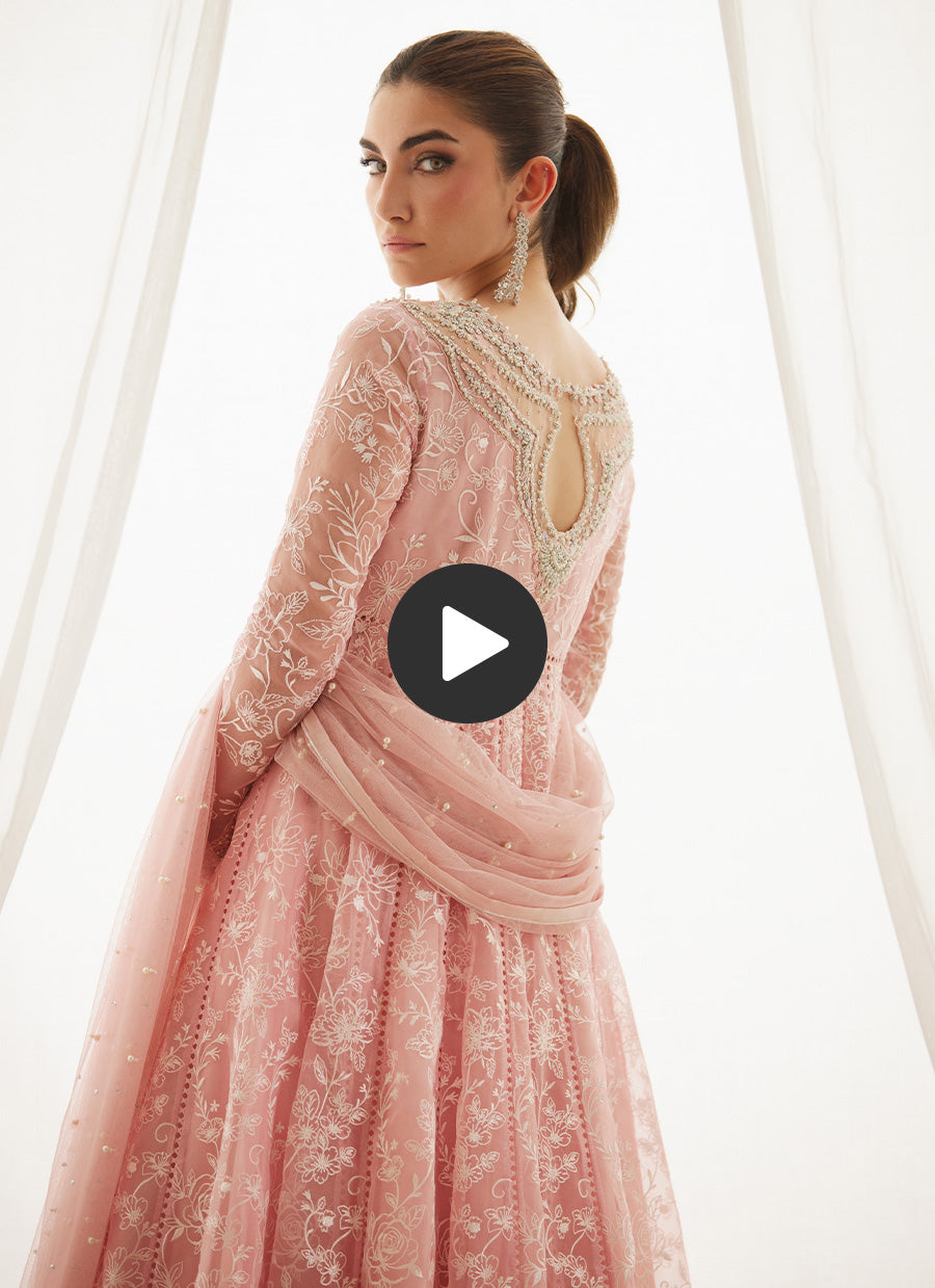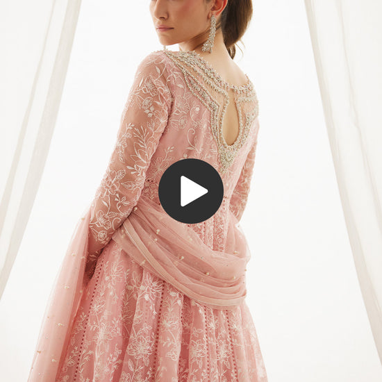 A dreamy kalidar in delicate organza, brought to life with pearls, sequins, and Swarovski crystals painstakingly hand embellished alongside intricate nakshi and silk thread accents. 3D floral details bloom across the neckline and sleeves, adding a touch of romance to the silhouette. Paired with a raw silk lehnga trimmed with an embroidered border and a soft net dupatta scattered with pearls and stones, this ensemble strikes the perfect balance between elegance and whimsy — ideal for the modern wedding guest.
