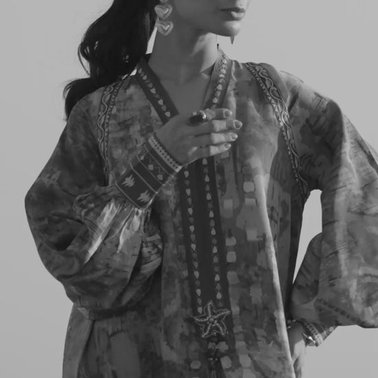 Elegantly understated, this crepe printed kaftan is enhanced with a raw silk embroidered neckline. The side slits, daman, and statement sleeves are finished with a coordinating raw silk border, adding subtle structure and texture to the flowing silhouette. Rendered in cool tones, this kaftan is perfect for those who appreciate timeless elegance with thoughtful detailing.