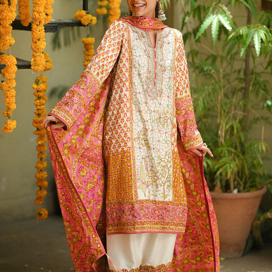 A beautiful ivory block-printed kurta adorned with vibrant floral embroideries. The kurta is embellished with intricate single dhaagha ari, zardozi, threadwork, and pitta work, showcasing exquisite craftsmanship. It is paired with a block-printed raw silk izaar that includes a hand-embellished border, adding a refined touch to the outfit. The look is completed with a stunning block-printed dupatta, embellished with intricate handwork throughout, enhancing the overall elegance and making it a perfect choice for every age and any festive occasion.