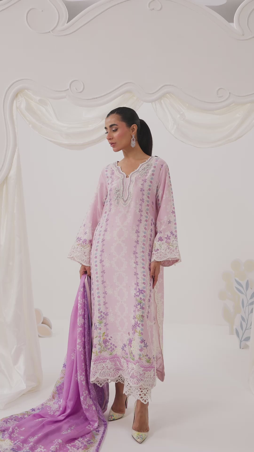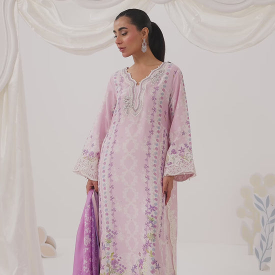 Paired with a cutwork trouser for added texture and finished with a printed medium silk dupatta, detailed with embroidered borders, the ensemble feels balanced, polished, and thoughtfully layered. Vela is ideal for intimate gatherings and refined daytime occasions, offering a look that feels composed, feminine, and timeless.