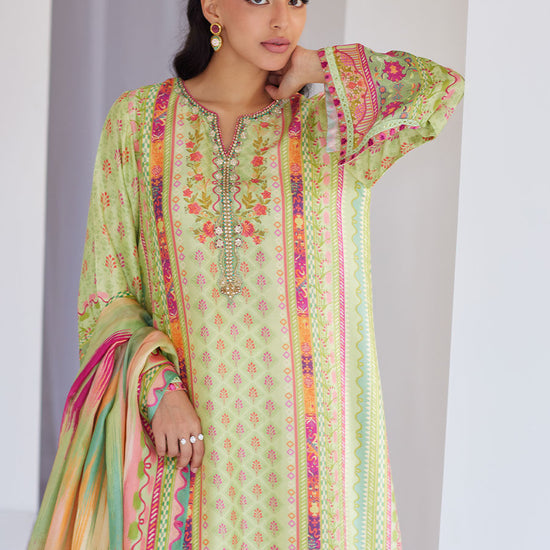 The gorgeous, digitally printed, pure medium silk dupatta in uplifting green, pink and coral tones completes your ensemble.