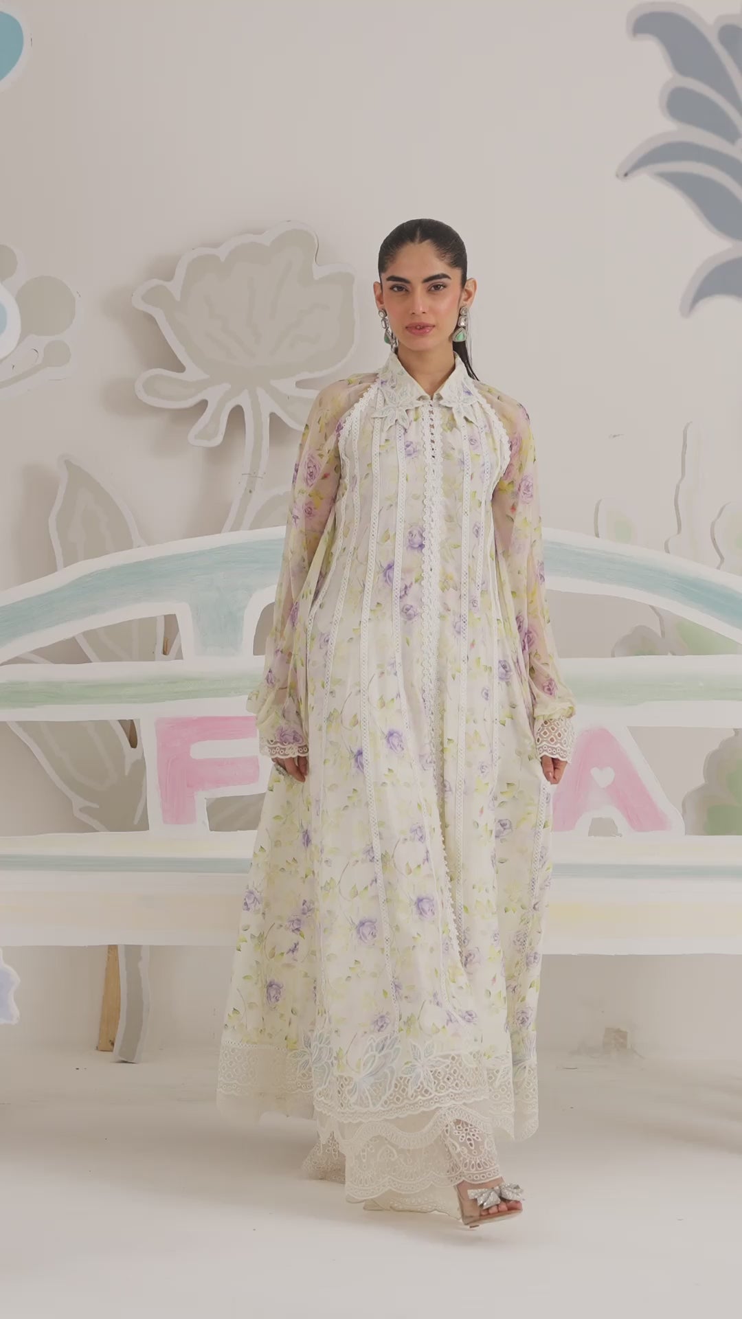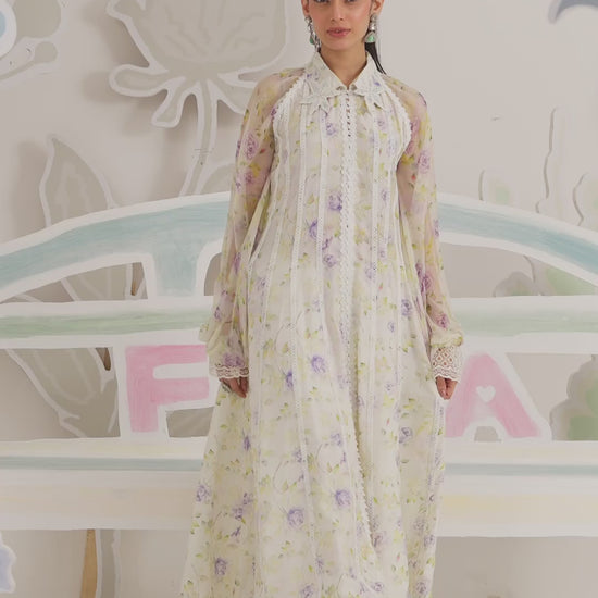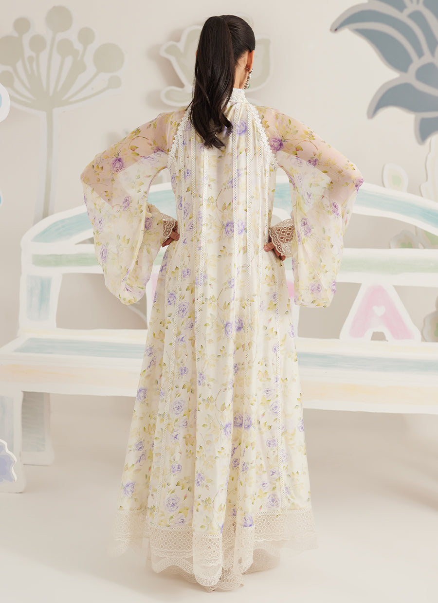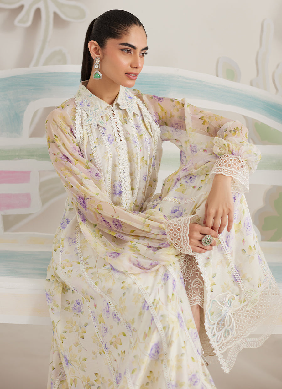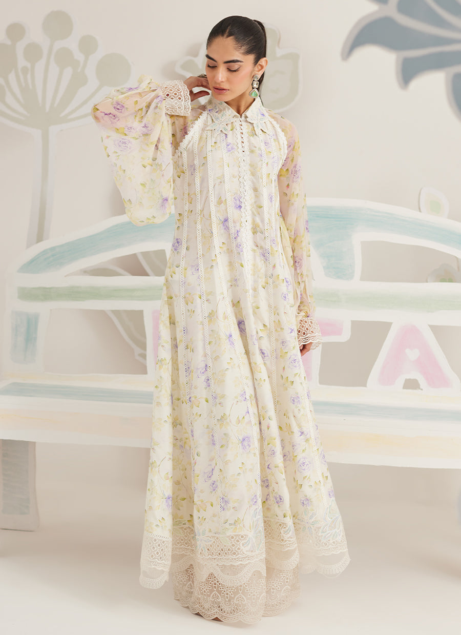 Light, graceful, and quietly romantic, Veya is designed for moments that call for effortless refinement. The flowing silhouette is crafted in a sheer, printed fabric that moves beautifully with every step, while delicate lace accents lend a soft sense of structure. The subtle floral placement keeps the look airy and composed, making it ideal for relaxed festive dressing.