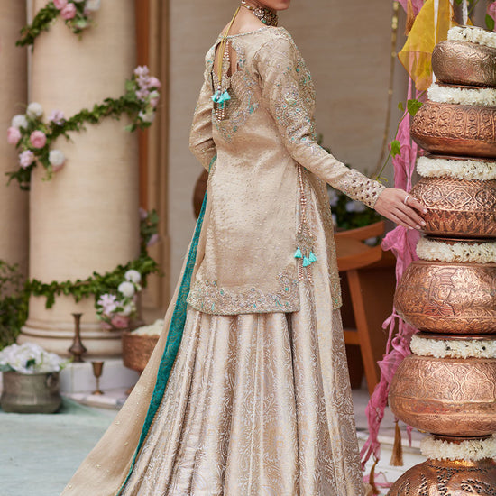 Contemporary silhouettes meet exquisite crafts and hand embroidery painstakingly rendered on pure, luxe fabrics. Be the epitome of effortless glamour with our ethereal vyara ensemble. A dramatic short jacket cut from pure zari silk, hand embellished with sitara, kora, dabka, Swarovski crystals, pure silk thread work in shades of teal. To further enhance the beauty of this shirt we have added a dull gold body with gold and silver chan all over. The front open jacket is layered over a jamawar lehenga with sitara chann all over. The ensemble is completed with a gold hand embellished dupatta finished with an intricate hand worked border. This undeniably glamorous ensemble is a sure shot winner for years to come.