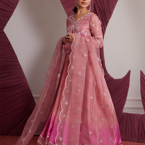 This soft pink, floor-length ensemble exudes elegance and grace, featuring a flared silhouette that creates beautiful, flowing movement. The bodice is intricately adorned with delicate floral embroidery in pastel shades of pink, blue, and white, which gracefully extends to the full-length sheer sleeves, adding a touch of ethereal grace. Crafted from pure, medium silk, the fabric transitions into a soft, ombre effect at the hem, blending shades of pink and deep rose for a seamless finish. Completing the look is a sheer organza dupatta, embellished with scattered floral embroidery and a scalloped hem, perfectly complementing the overall design with its soft, feminine charm.