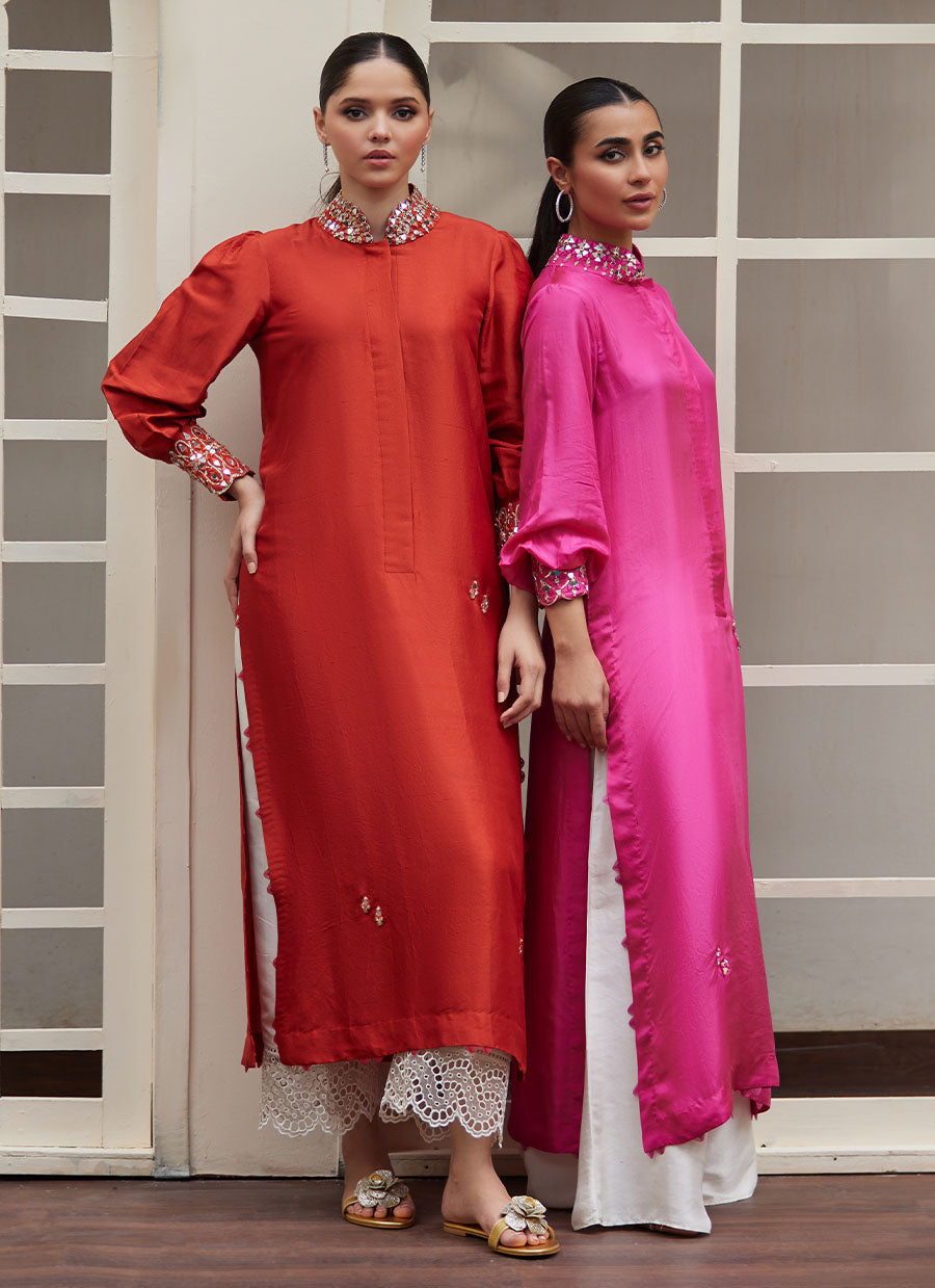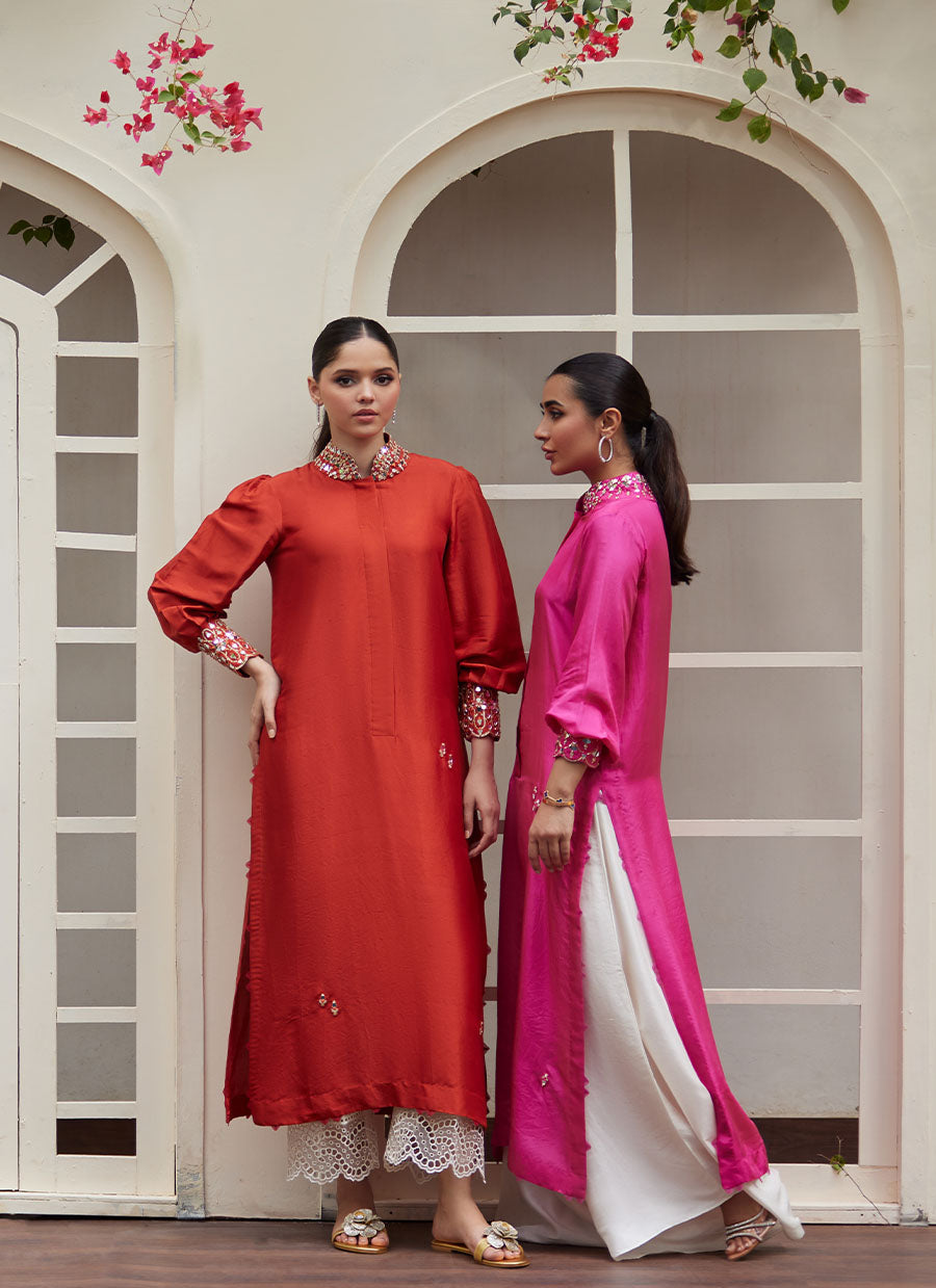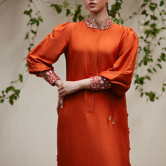 The collar with slits that sits close to the neck, as well as the cuffed sleeves are adorned with unique, hand embellished mirror work to add that oomph to your look. The shirt is embellished with handmade motifs that are adorned with sheesha and rhinestones.