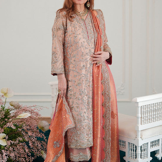 To complement this shirt, we have added hand embellished izaar pants in pure lame silk. This breath-taking shirt is paired with a two tone soft tissue coral dupatta embellished with a heavy hand worked border and motifs all over.