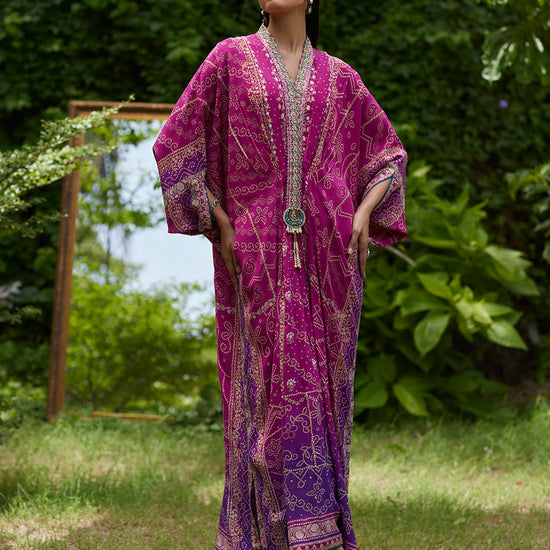 Signature FTA florals shine through in this striking kaftan. The much loved chunri print is given a contemporary treatment in our kaftan. A canvas of vibrant magenta crepe silk smoothly flows into stunning deep violet hue.