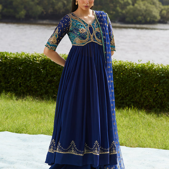 Beautifully crafted from an absolutely bewitching shade of navy-blue silk, offset with teal and emerald hues — this ensemble strikes the perfect balance between elegant and eye-catching. The rich jewel tone is made even more radiant by the fluid sheen of pure silk, creating an aura of timeless sophistication.