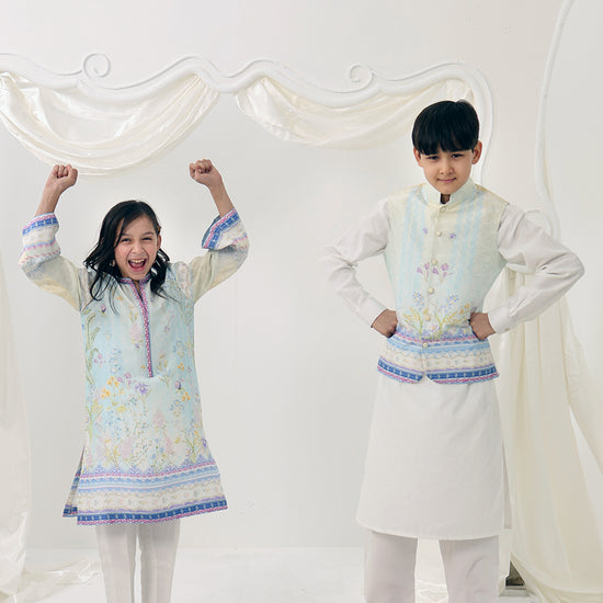 Zayan Mini is a refined festive look that blends tradition with soft pastel charm. A crisp white kurta shalwar is paired with a delicately printed waistcoat, finished with subtle detailing for a polished yet playful kidswear ensemble.
