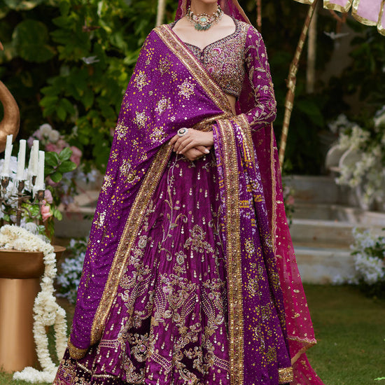 Stand out in the most striking plum and magenta two tone lehenga choli that is heavily embellished with glimmering gold hand work aided with coordinating silk thread work making it a contemporary classic. The spectacular bodice handcrafted with diamantes makes you shine amongst the crowd. The lehegna cut from pure silk jamawar, is giving a gorgeous ombre treatment as the deep plum velvet which is appliqued on the border of kalis smoothly flows into magenta lehenga and adds an oomph and additional shine to the outfit. Hand embellished tassel latkans hanging from the lehenga making that swirl unforgettable. The pure net ombre dupatta features heavy sitara chan and is finished with a beautiful gold scalloped border handcrafted in zardozi, ari, and thread-work. Densely embellished with a triple sequins spray for that extra sparkle. A modern - updated version of classic plum lehenga choli with details to die for. Making you stand out in the most effortless way.