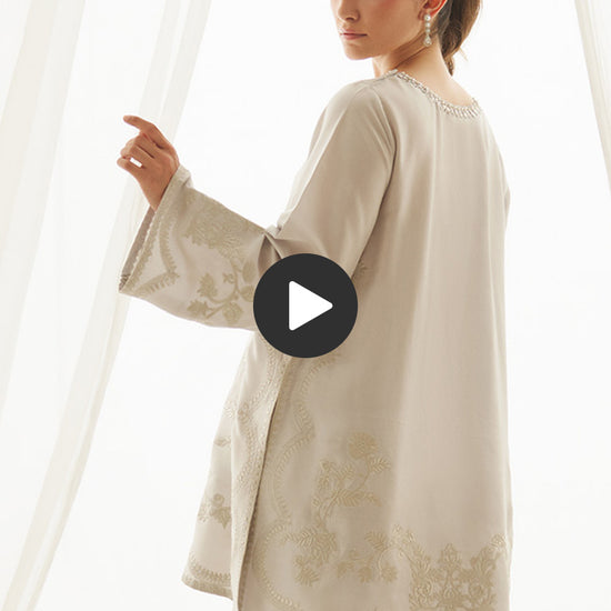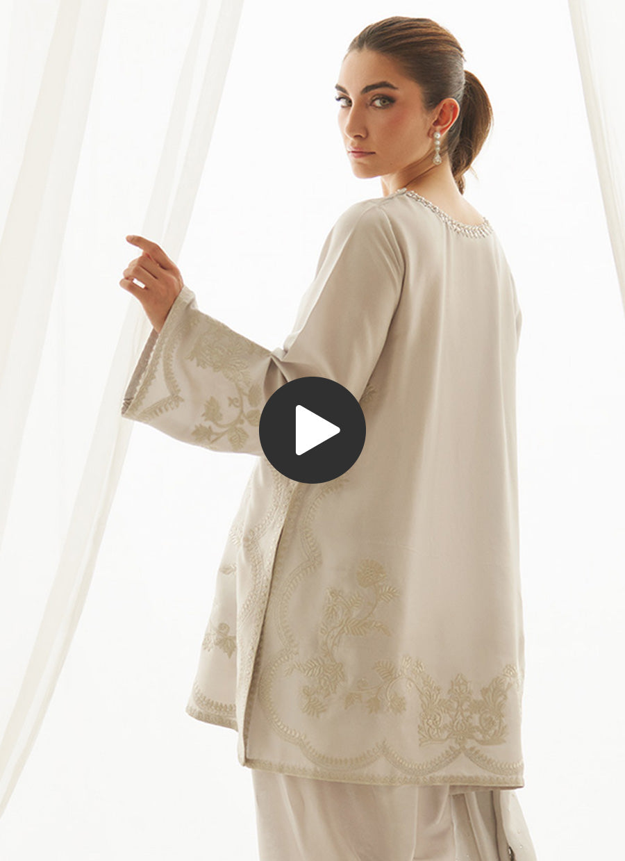 Refined yet striking — a silver grey raw silk shirt, intricately hand-embellished with mukesh at the neckline, pairs with a tailored shalwar accented by delicate embroidery. A pure medium silk dupatta, scattered with subtly shimmering sequins, completes the look with quiet glamour.